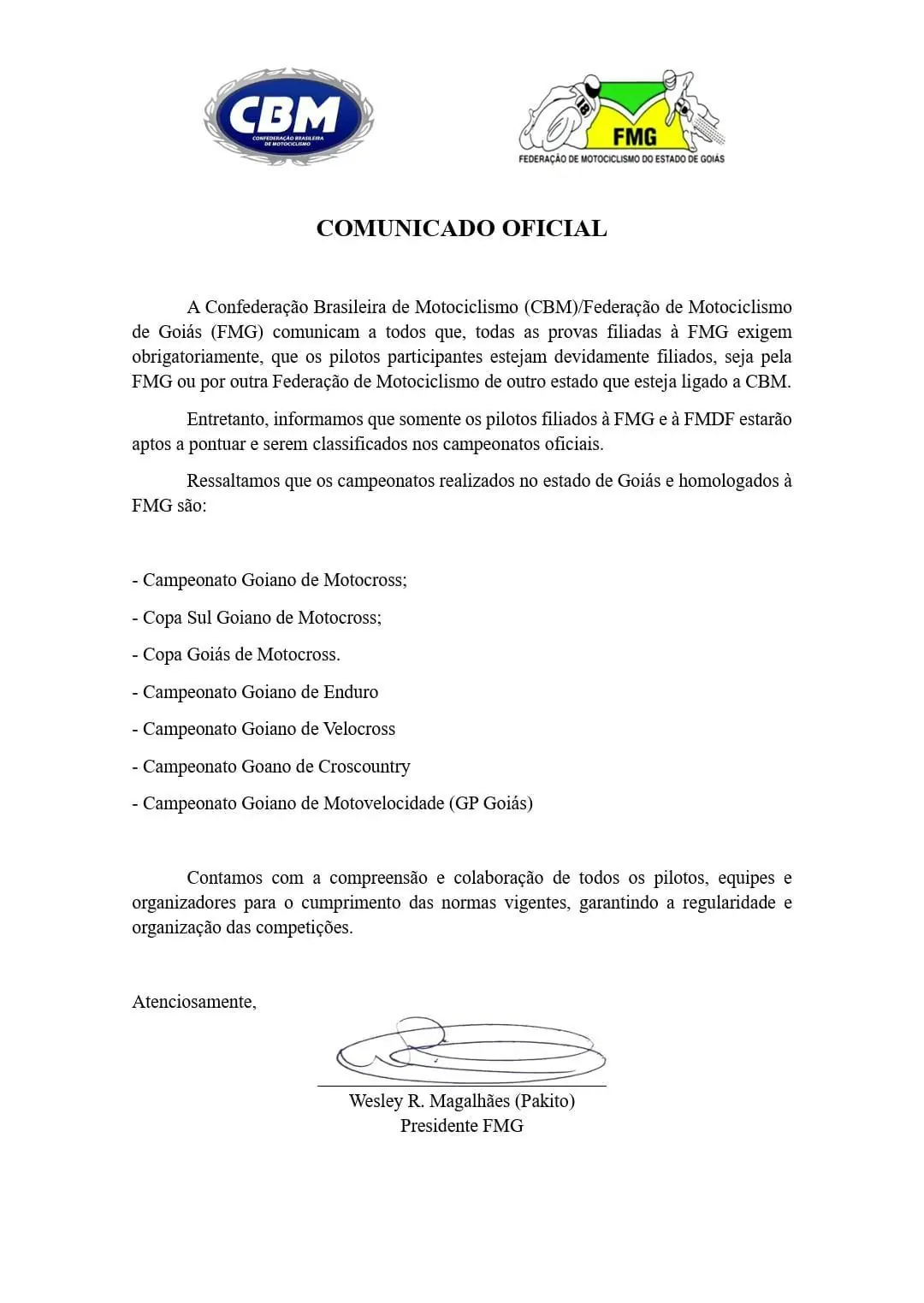 Wesley Magalhães, mais conhecido como Pakito é reeleito como presidente da Federação de Motociclismo do Estado de Goiás - FMG. Sendo mantida com a mesma gestão anterior. 1 vice presidente Karoline Feichtenberger, 2 vice presidente Marco Aurélio Ferreira.